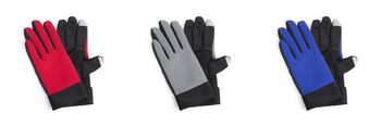 Paire de gants de sport en polyester et lycra durables. Dans un design bicolore, avec une base noire et des détails de couleur. La prise en main de la paume et la fonction tactile sur les index et le pouce. Taille unique pour les adultes. - dim. :  - poids : 36g
