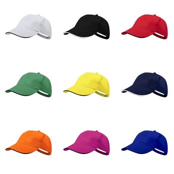 Casquette à 5 panneaux en 100 % coton peigné. Dans une gamme variée de couleurs vives, avec sandwich coloré et rembourrage sur la visière. Trous d’aération brodés et fermeture velcro réglable. - dim. :  - poids : 60g